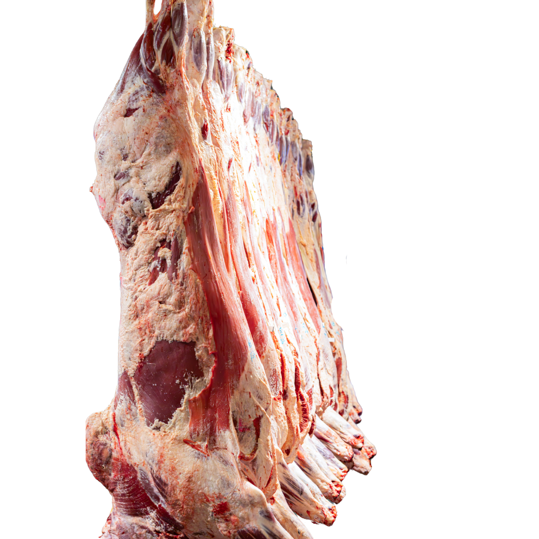 Media res en corte longitudinal a lo largo de la columna vertebral del animal, incluye: piña, asado y cuarto